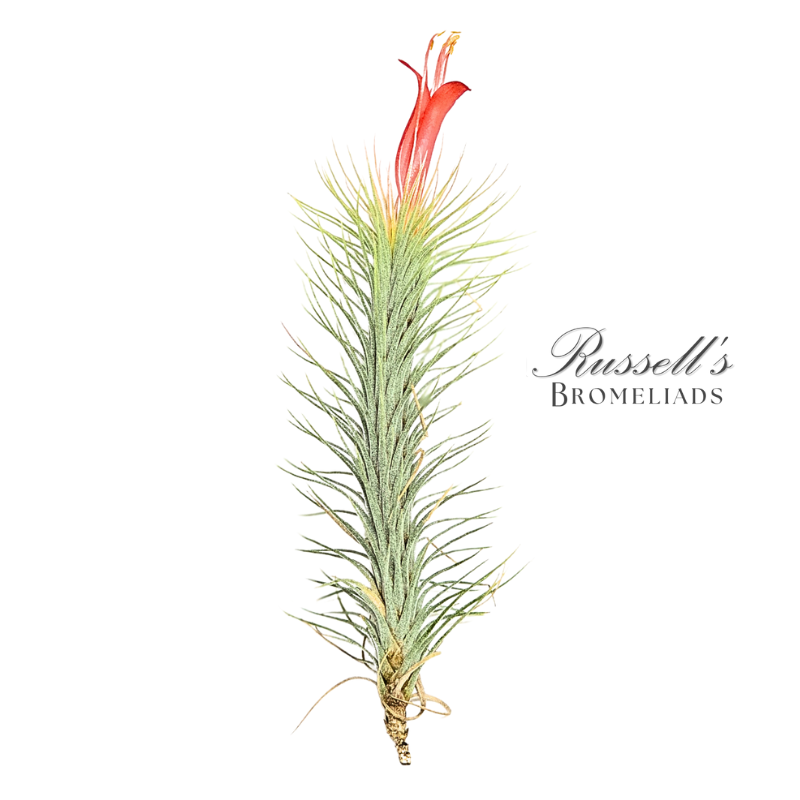 Native to South America, Funckiana has thin, light-green to silvery leaves that come up from its base and spread out about an inch from its center in a rosette shape. The leaves do not get any longer; instead, Funckiana continues to grow vertically, adding new layers as leaves above the previous ones. In some cases, the plant will grow straight and resemble a long pine branch with soft needles. Alternatively, it may twist and turn into funky shapes. During blooming the top needles will blush red and a vibrant red trumpet flower will emerge. These make beautiful hanging clusters due to the many pups it produces.