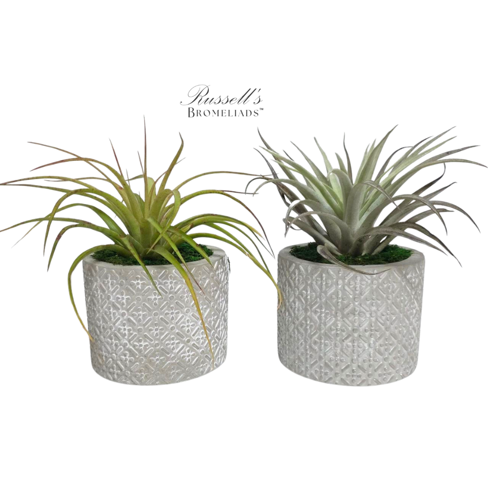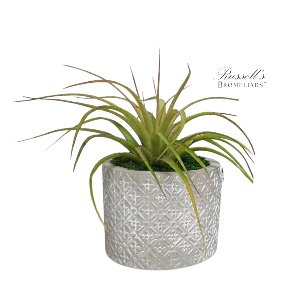 This elegant 5″ cement pot features an intricately embossed pattern holding assorted Air Plants surrounded by moss. The plants vary from a large 5-7″ one to a garden of smaller ones (grower’s choice). The natural texture and muted tone of the pot contrast beautifully with the exotic plants’ bright, natural colors. A perfect blend of modern design and organic charm for any upscale space.