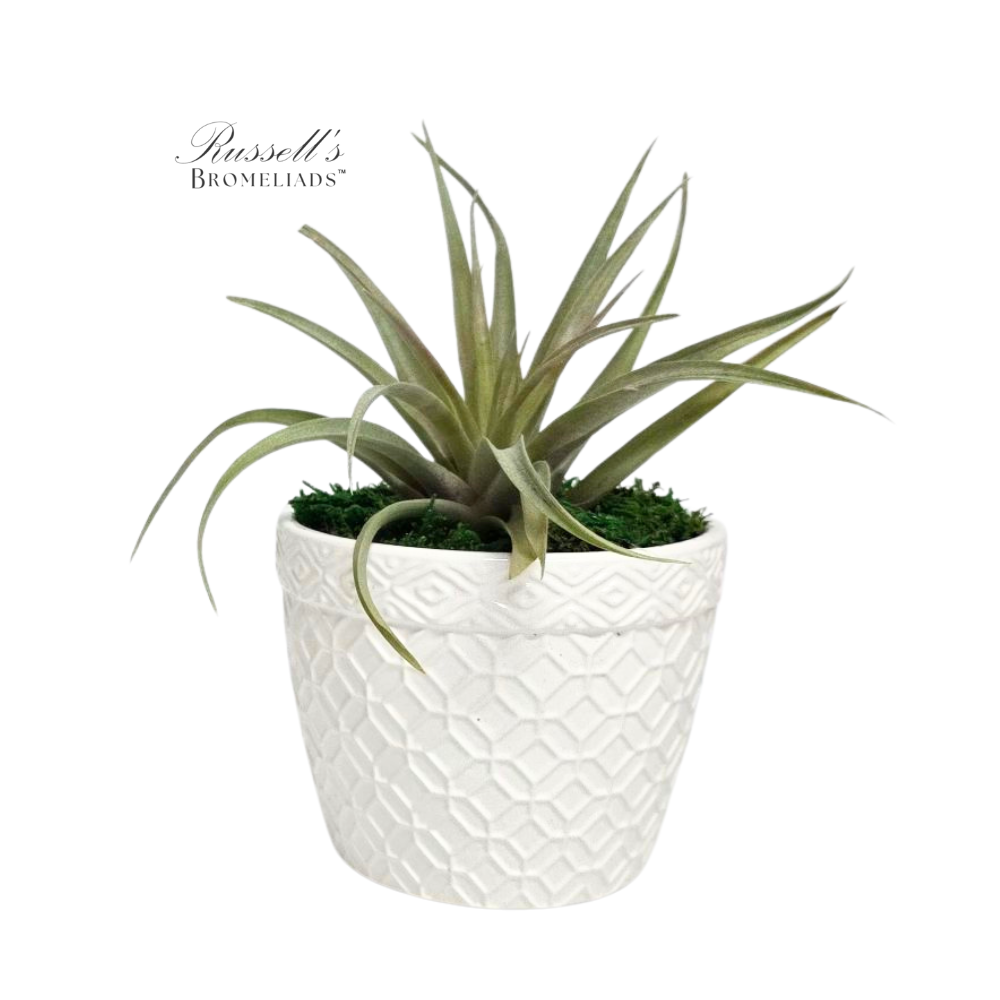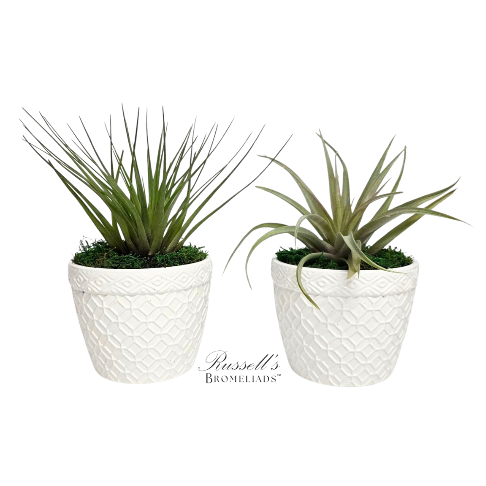 This striking 5″ white ceramic pot features a geometric embossed pattern, paired with a vibrant mix of Air Plants nestled in soft moss. The plant on each pot varies from a large 5-7″ Air Plant to a garden (grower’s choice), offering a dynamic display of textures and colors. A sophisticated accent that seamlessly blends natural beauty with contemporary design.